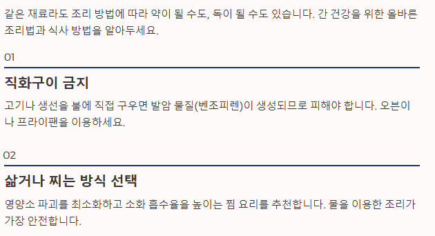 - 직화구이 금지: 고기나 생선을 불에 직접 구우면 발암 물질(벤조피렌)이 생성되므로 피해야 합니다.