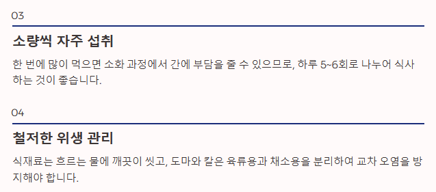 - 소량씩 자주 섭취: 한 번에 많이 먹으면 소화 과정에서 간에 부담을 줄 수 있으므로, 하루 5~6회로 나누어 식사하는 것이 좋습니다.