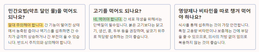 - 저염식 습관: 복수가 차거나 부종이 생기는 것을 막기 위해 싱겁게 먹어야 합니다.