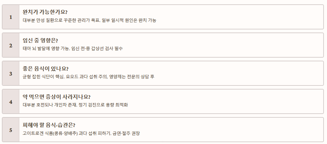- 균형 잡힌 식단: 신선한 채소와 과일, 통곡물, 살코기 등 균형 잡힌 식사를 통해 전반적인 건강을 유지하세요. 과도한 요오드 섭취는 피하는 것이 좋습니다.