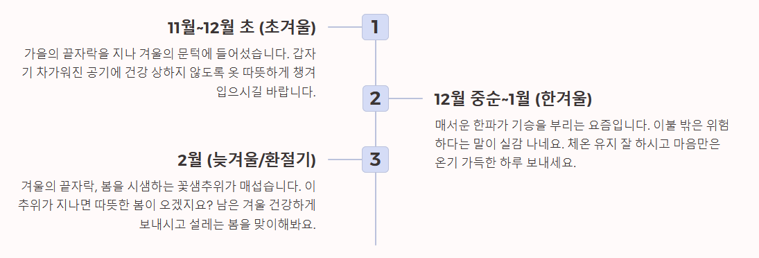 겨울이라도 시기마다 느껴지는 분위기가 다릅니다. 초겨울의 쌀쌀함부터 늦겨울의 봄 기다림까지, 시기 적절한 문구를 골라보세요.