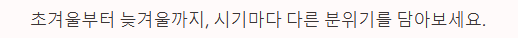 - "거리 곳곳에 겨울 분위기가 물씬 느껴집니다. 다가오는 연말, 따뜻한 계획 세우시며 행복하게 한 해를 마무리하시길 응원합니다."