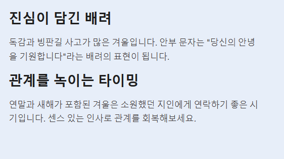 또한, 한 해를 마무리하는 12월과 새해를 시작하는 1월이 포함되어 있어, 비즈니스 파트너나 소원했던 지인에게 자연스럽게 연락을 취하기 가장 좋은 타이밍이기도 합니다. 센스 있는 겨울 인사로 꽁꽁 얼어붙은 관계를 녹여보세요.