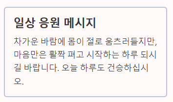 | 미세먼지 | "삼한사미(3일 춥고 4일 미세먼지)라더니 공기가 탁하네요. 마스크 꼭 챙기시고 물 자주 드시며 호흡기 건강 챙기는 하루 되세요." | 마스크, 호흡기, 수분 섭취 |