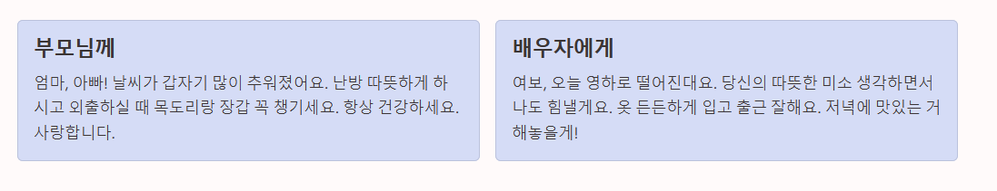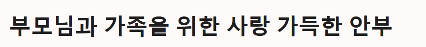 - "엄마, 아빠! 날씨가 갑자기 많이 추워졌어요. 난방 따뜻하게 하시고 외출하실 때 목도리랑 장갑 꼭 챙기세요. 항상 건강하세요. 사랑합니다."