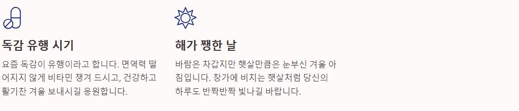 | 독감 유행 | "요즘 독감이 유행이라고 합니다. 면역력 떨어지지 않게 비타민 챙겨 드시고, 건강하고 활기찬 겨울 보내시길 응원합니다." | 면역력, 독감 조심, 비타민 |