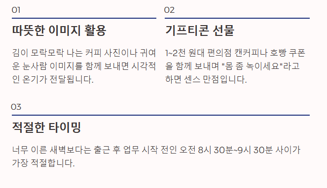 - 기프티콘 선물: 추운 날, 1~2천 원대의 편의점 캔커피나 호빵 쿠폰을 함께 보내며 "몸 좀 녹이세요"라고 하면 센스 만점입니다.