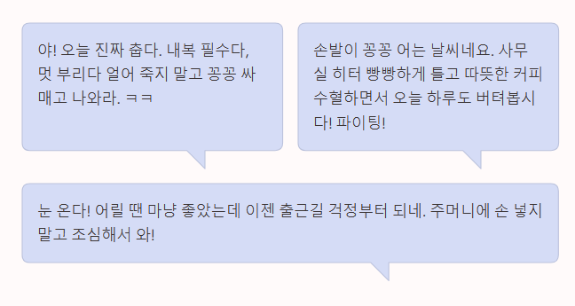 - "OO님, 손발이 꽁꽁어는 날씨네요. 사무실 히터 빵빵하게 틀고 따뜻한 커피 수혈하면서 오늘 하루도 버텨봅시다! 파이팅!"