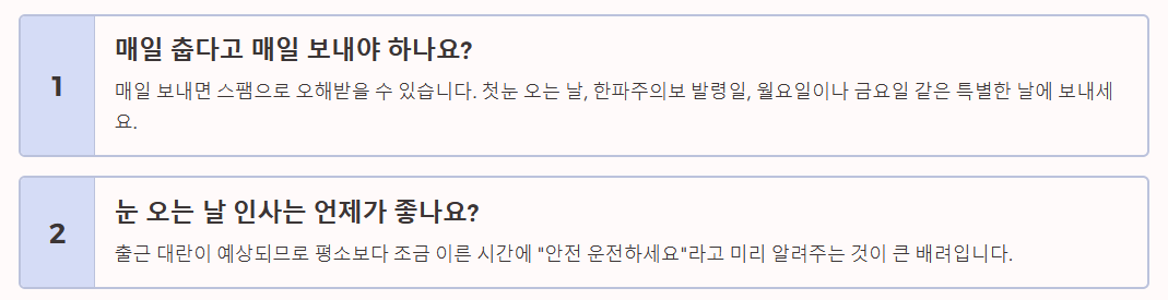 - 매일 보내면 스팸으로 오해받을 수 있습니다. '첫눈' 오는 날, '한파주의보'가 발령된 날, 혹은 월요일이나 금요일처럼 특별한 기점이 되는 날에 보내는 것이 효과적입니다.
