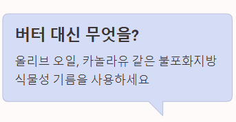 - A. 버터(포화지방) 대신 올리브 오일, 카놀라유 등 불포화지방이 풍부한 식물성 기름을 사용하고, 빵에 발라 먹을 때는 견과류로 만든 스프레드나 아보카도를 활용하는 것이 좋습니다.
