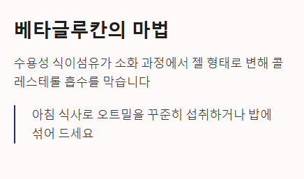 - 섭취 팁: 아침 식사로 오트밀을 꾸준히 섭취하거나 밥에 섞어 먹는 것이 좋습니다.