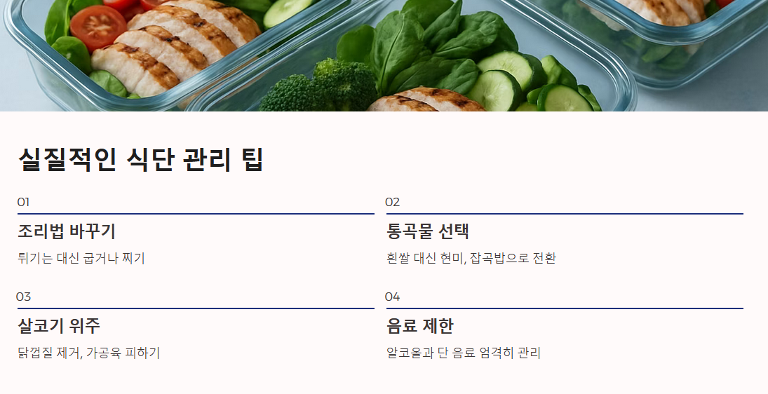 - 육류 지방 피하기: 닭고기는 껍질을 제거하고, 소고기나 돼지고기는 살코기 위주로 섭취합니다. 가공육(소시지, 베이컨)은 피하는 것이 좋습니다.