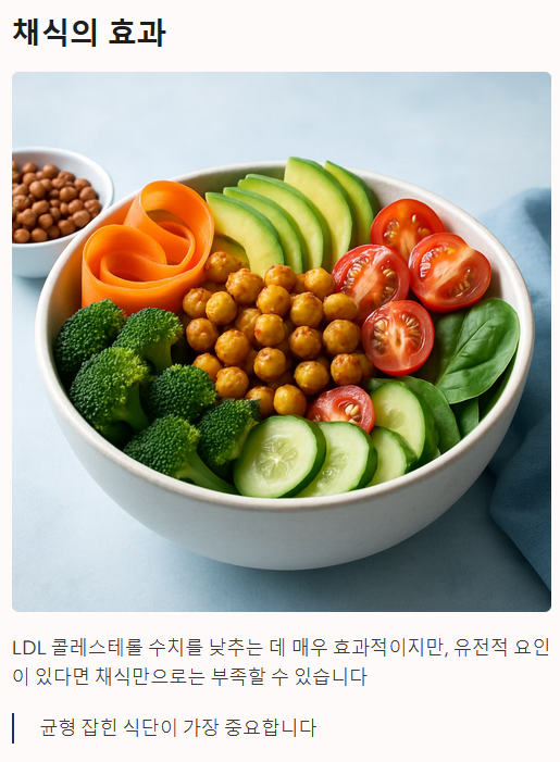- A. 채식은 LDL 콜레스테롤 수치를 낮추는 데 매우 효과적이지만, 유전적 요인이나 다른 기저 질환이 있다면 채식만으로 완치되기는 어렵습니다. 또한, 채식이라도 당분이나 기름진 음식을 많이 먹으면 중성지방이 높아질 수 있으므로 균형 잡힌 식단이 중요합니다.
