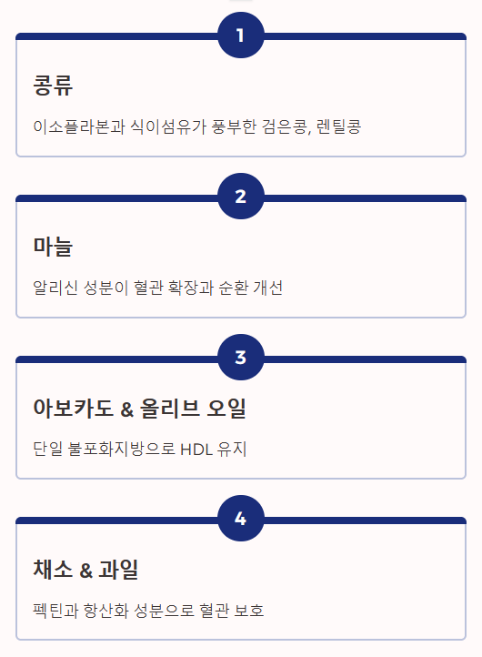 다음 음식들은 식이섬유, 불포화지방산, 항산화 성분이 풍부하여 혈관 건강에 직접적인 도움을 줍니다.