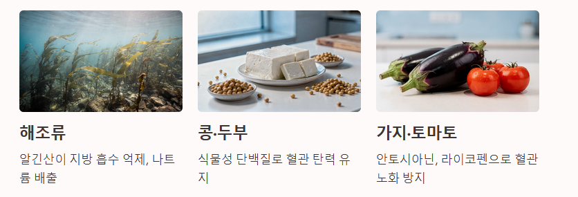 - 불포화지방산: 등푸른 생선(고등어, 연어)과 견과류는 혈관 건강에 필수적입니다.