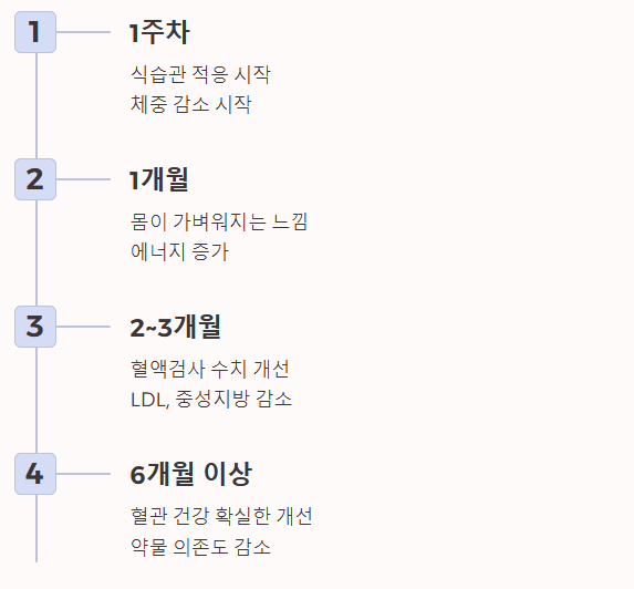 - 개인차가 있지만, 철저한 식단 관리와 운동을 병행할 경우 보통 2~3개월 뒤 혈액 검사에서 유의미한 수치 변화를 확인할 수 있습니다.