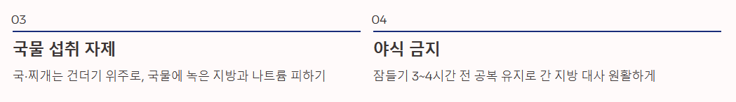 - 국물 섭취 자제: 국이나 찌개의 국물에는 다량의 나트륨과 녹아 나온 지방이 함유되어 있습니다. 건더기 위주로 식사하는 습관을 들이세요.