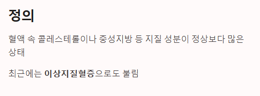 - A. 공복 상태(12시간 금식)에서 채혈하여 혈액 내 지질(콜레스테롤, 중성지방) 수치를 측정합니다. 이 수치가 공식 진단 기준을 넘으면 진단됩니다.