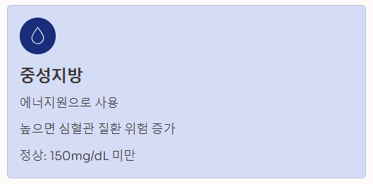 | 중성지방 TG | 에너지원으로 사용되고 남은 지방. 높으면 심혈관 질환 위험 및 췌장염 위험 증가. | 150mg/dL 미만 |