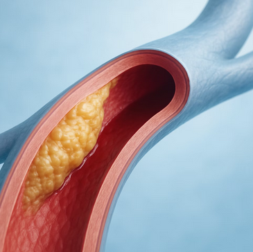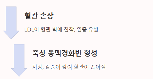 높은 LDL 콜레스테롤은 혈관 내피세포를 손상시키고 혈관 벽에 침착되어 염증을 일으킵니다. 시간이 지나면서 이곳에 지방, 칼슘 등이 쌓여 죽상 동맥경화반(Plaque)을 만들고 혈관을 좁고 딱딱하게 만듭니다.