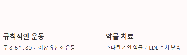 - A. 가장 기본은 식이요법, 운동, 금연 등의 생활 습관 개선입니다. 수치가 높거나 다른 위험 요인이 많을 경우, LDL을 낮추는 스타틴 계열 약물 등의 치료를 병행합니다.