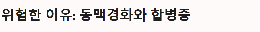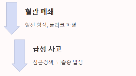 - 급성 사고: 심장에 혈액을 공급하는 관상동맥이 막히면 심근경색, 뇌혈관이 막히면 뇌졸중(뇌경색)으로 이어져 생명을 위협하거나 영구적인 장애를 남깁니다.