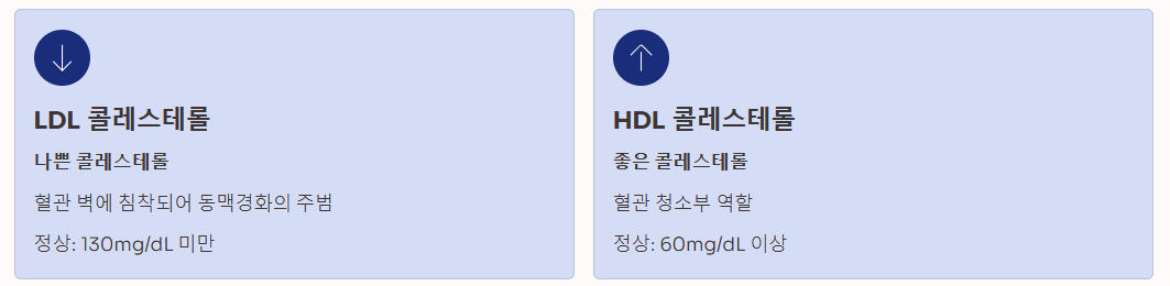| LDL 콜레스테롤 (저밀도 지단백) | '나쁜 콜레스테롤'. 혈관 벽에 침착되어 동맥경화를 일으키는 주범. | 130mg/dL 미만 |