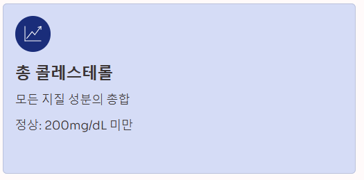 | 총 콜레스테롤 TC | 모든 지질 성분의 총합. | 200mg/dL 미만 |