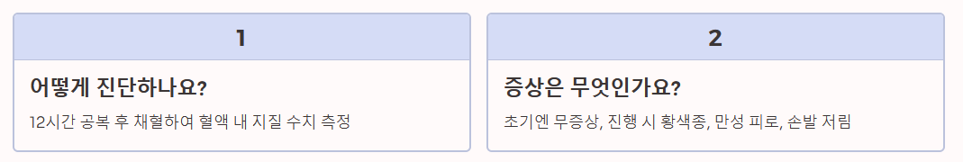- A. 초기에는 대부분 무증상입니다. 증상이 나타난다면 주로 콜레스테롤 침착으로 인한 **황색종(피부 지방 덩어리)**이나 혈액 순환 장애로 인한 만성 피로, 어깨 결림, 손발 저림 등이 나타날 수 있습니다.