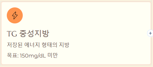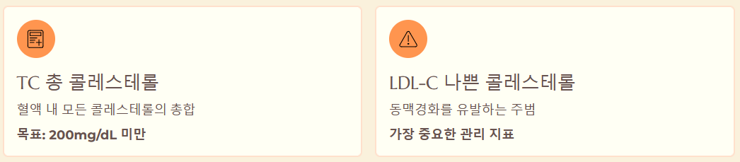 | TC | 총 콜레스테롤 | 혈액 내 모든 콜레스테롤의 총합. | 200mg/dL 미만 유지 |