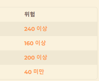 | HDL 콜레스테롤 | 60 이상 | 40 ~ 59 | 40 미만 (남성 기준) |