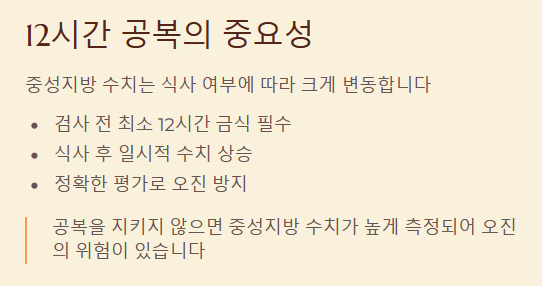 중성지방(TG) 수치는 식사 여부에 따라 크게 변동합니다. 식사 후에는 일시적으로 중성지방 수치가 높아지기 때문에, 정확한 진단과 평가를 위해서는 검사 전 최소 12시간 금식이 필수 조건입니다. 공복을 지키지 않으면 중성지방 수치가 높게 측정되어 오진의 위험이 있습니다.