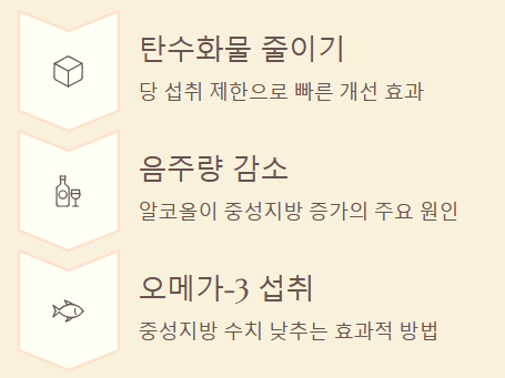 중성지방 수치(200mg/dL 이상)가 높다면, 우선적으로 탄수화물 섭취와 음주량을 줄이는 것이 중요합니다. 중성지방은 LDL 콜레스테롤과 달리 식이요법만으로도 빠른 개선 효과를 볼 수 있습니다. 오메가-3 지방산 섭취도 중성지방 수치를 낮추는 데 효과적입니다.