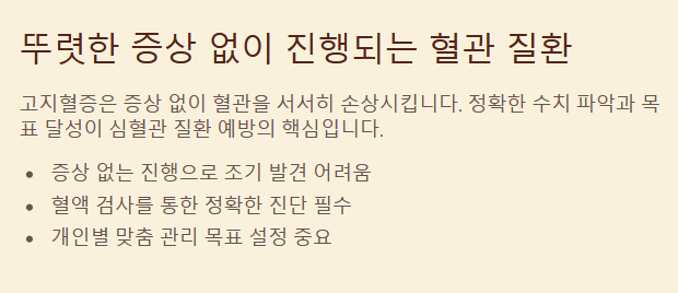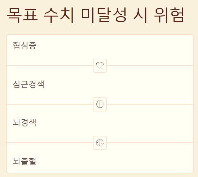 - A. 목표 수치에 도달하지 못하면 혈관 내 동맥경화성 변화가 지속되어 협심증, 심근경색, 뇌경색, 뇌출혈 등 생명을 위협하는 심뇌혈관 질환 발생 위험이 높아지게 됩니다.