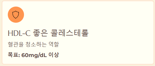 | HDL-C | 고밀도 콜레스테롤 (좋은 콜레스테롤) | 혈관 벽에 쌓인 콜레스테롤을 간으로 회수하여 혈관을 청소하는 역할. | 높을수록 좋음 (특히 60mg/dL 이상) |