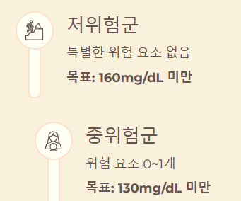 | 중위험군 | 심장병 위험 요소 0~1개 (고혈압, 흡연, 가족력 등) | 130 미만 |