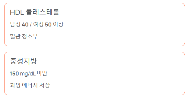 | HDL 콜레스테롤 | 남성 40 이상, 여성 50 이상 | 혈관 청소부. 수치가 높을수록 심혈관 질환 예방에 유리. |