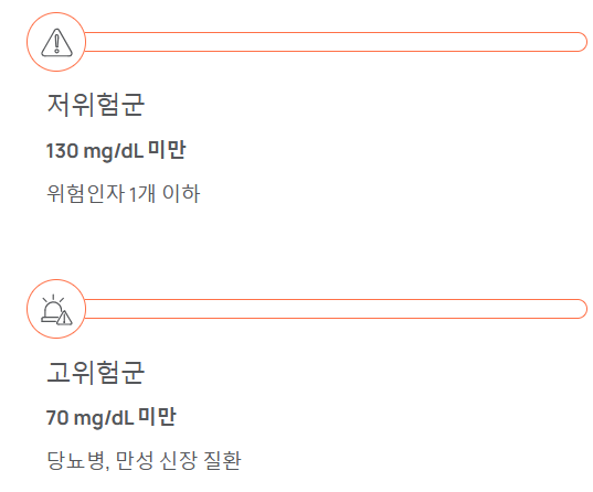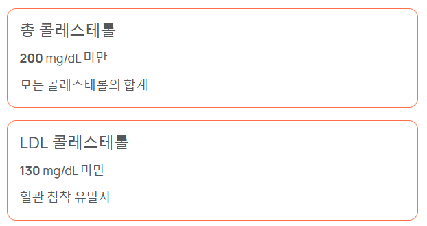 - LDL 콜레스테롤 ('나 콜레스테롤'): 130 mg/dL 미만 (일반 저위험군)