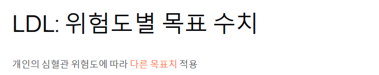 | LDL 콜레스테롤 | 130 미만 (일반) | 혈관 침착 유발자. 수치가 낮을수록 좋으며, 환자의 위험도에 따라 목표치 엄격하게 설정. |