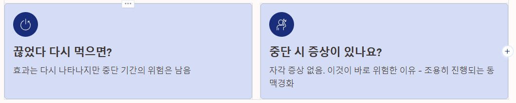 - A. 다시 복용하면 효과가 나타나지만, 중단했던 기간 동안 증가했던 심혈관 위험이 사라지는 것은 아닙니다. 중단 기간 동안 동맥경화가 진행되었을 수 있습니다.