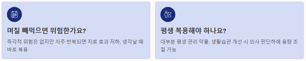 - A. 단기간 복용을 잊더라도 즉각적인 심각한 위험은 없지만, 자주 빼먹으면 혈중 약물 농도가 떨어져 치료 효과가 저하됩니다. 생각났을 때 바로 복용하되, 다음 복용 시간이 가깝다면 건너뛰고 정해진 시간에 복용합니다(이중 복용 금지).