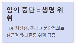 - LDL 콜레스테롤 급증: 중단 후 수주에서 2~3개월 이내에 LDL 수치가 치료 전 수준으로 빠르게 재상승합니다.