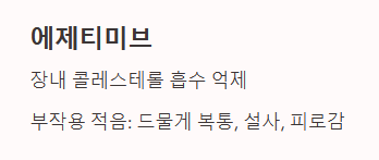 ① 에제티미브 (Ezetimibe) 장내 콜레스테롤 흡수를 억제하는 약물로, 스타틴에 비해 부작용이 적은 편입니다. 드물게 복통, 설사, 피로감이 나타날 수 있습니다.