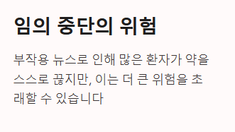- 대처: 임의 중단 절대 금물, 약물 용량 조절이나 종류 변경으로 해결 가능