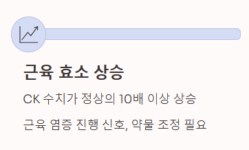 ② 근육 효소 수치 상승 (Myositis) 통증뿐만 아니라 혈액 검사상 근육 파괴 지표인 크레아틴 키나아제(CK) 수치가 정상 상한치의 10배 이상 상승하는 경우입니다. 이 경우 근육 염증이 진행되고 있다는 신호일 수 있어 약물 중단이나 변경이 필요합니다.
