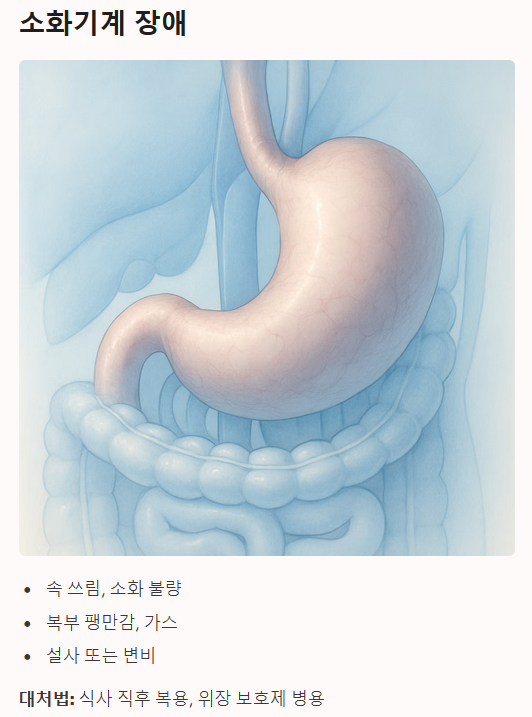 ① 소화기계 증상 속 쓰림, 소화 불량, 복부 팽만감, 가스 참, 설사 또는 변비 등의 위장 장애가 나타날 수 있습니다. 이는 약물을 식사 직후에 복용하거나, 위장 보호제를 함께 처방받는 것으로 완화될 수 있습니다.
