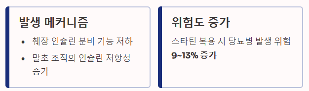 ① 발생 메커니즘 스타틴이 췌장의 인슐린 분비 기능을 저하시키거나 말초 조직의 인슐린 저항성을 증가시키는 것이 원인으로 지목됩니다.