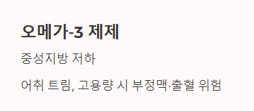 ③ 오메가-3 지방산 제제 전문의약품 오메가-3는 중성지방을 낮춥니다. 주요 부작용으로는 어취(비린내)가 올라오는 트림, 소화 불량이 있으며, 고용량 복용 시 심방세동(부정맥) 발생 위험이나 출혈 경향이 증가할 수 있다는 보고가 있습니다.