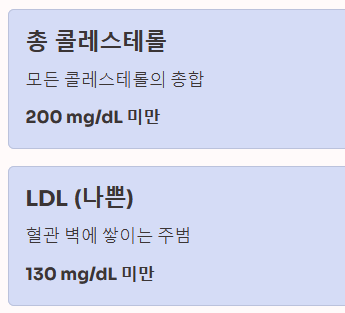 - LDL 콜레스테롤 ('나쁜 콜레스테롤'): 130 mg/dL 미만 (저위험군 기준)
