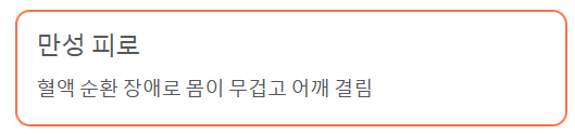 | 만성 피로 및 어깨 결림 | 혈액 순환 장애로 인해 몸이 무겁고 쉽게 피로하며, 어깨나 뒷목이 자주 뭉치고 결리는 느낌이 들 수 있습니다. | 혈액 순환 문제 |